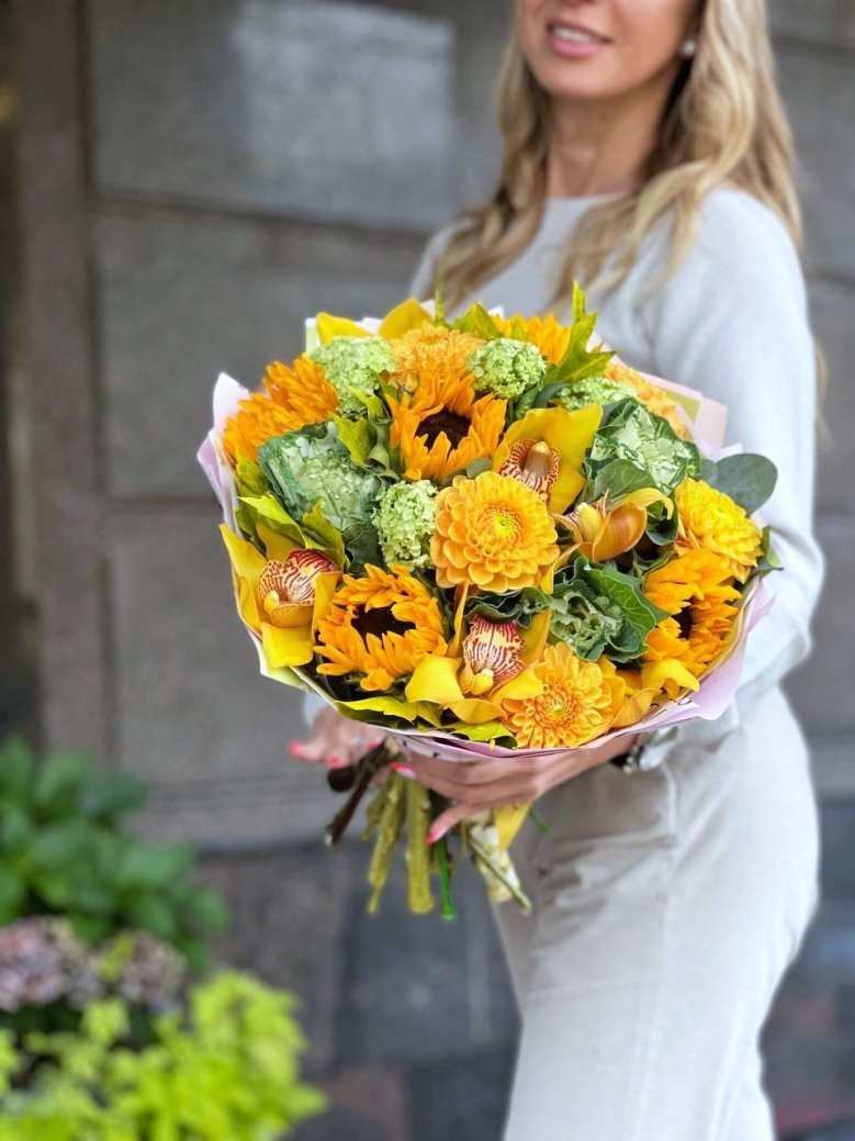 Авторский букет цветов — георгины, орхидея и брасика Вы можете заказать на сайте салона Цветочное изобилие. Цена 9 000 руб. В составе букета только свежие цветы, которые не завянут через несколько дней. Все цветочные композиции, представленные на сайте, являются авторскими. Каждый букет мы собираем учитывая все Ваши пожелания.