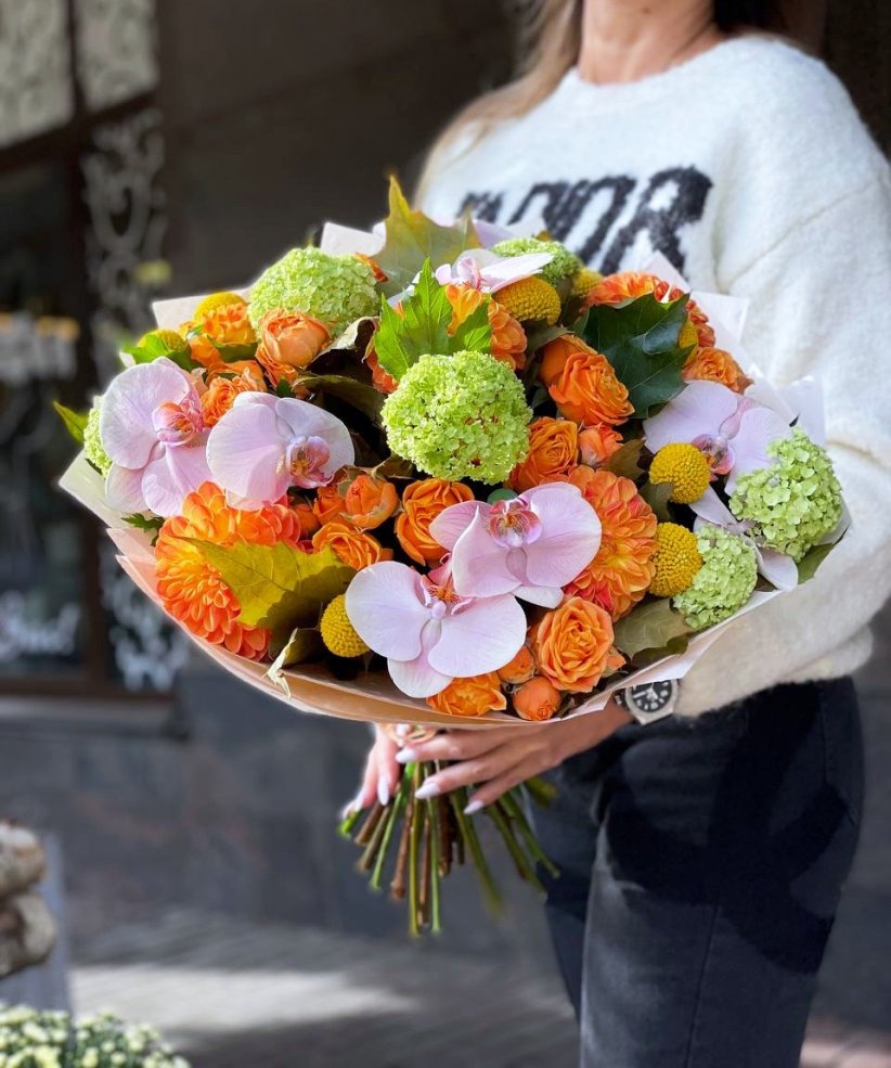 Авторский букет цветов — георгины, пионовидные розы, вибурнум и орхидеи