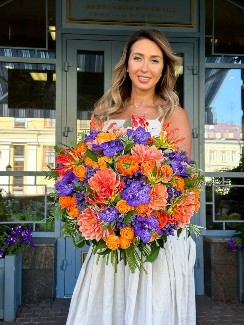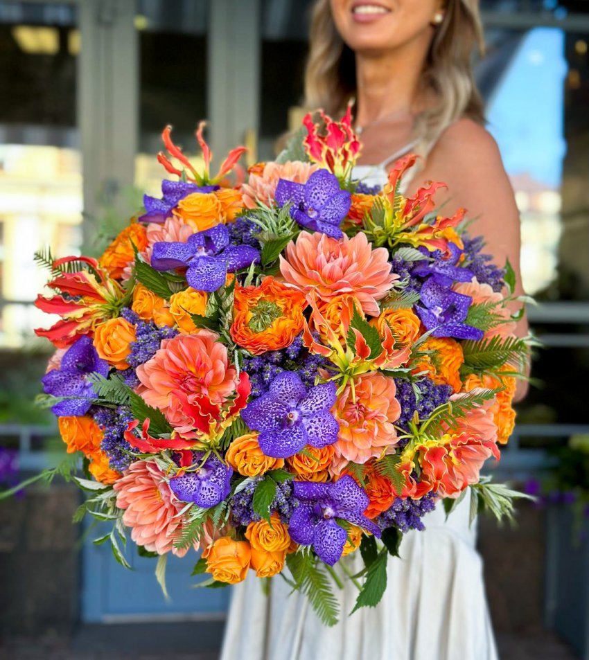 Авторский букет цветов — георгины, садовые розы, орхидеи и глариоза