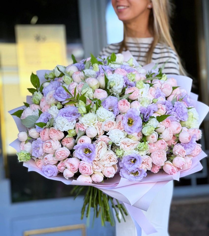 Авторский букет цветов — пионовидные розы, лизиантус и малина