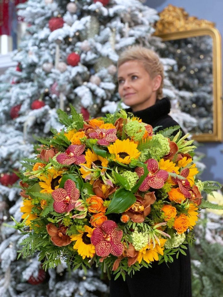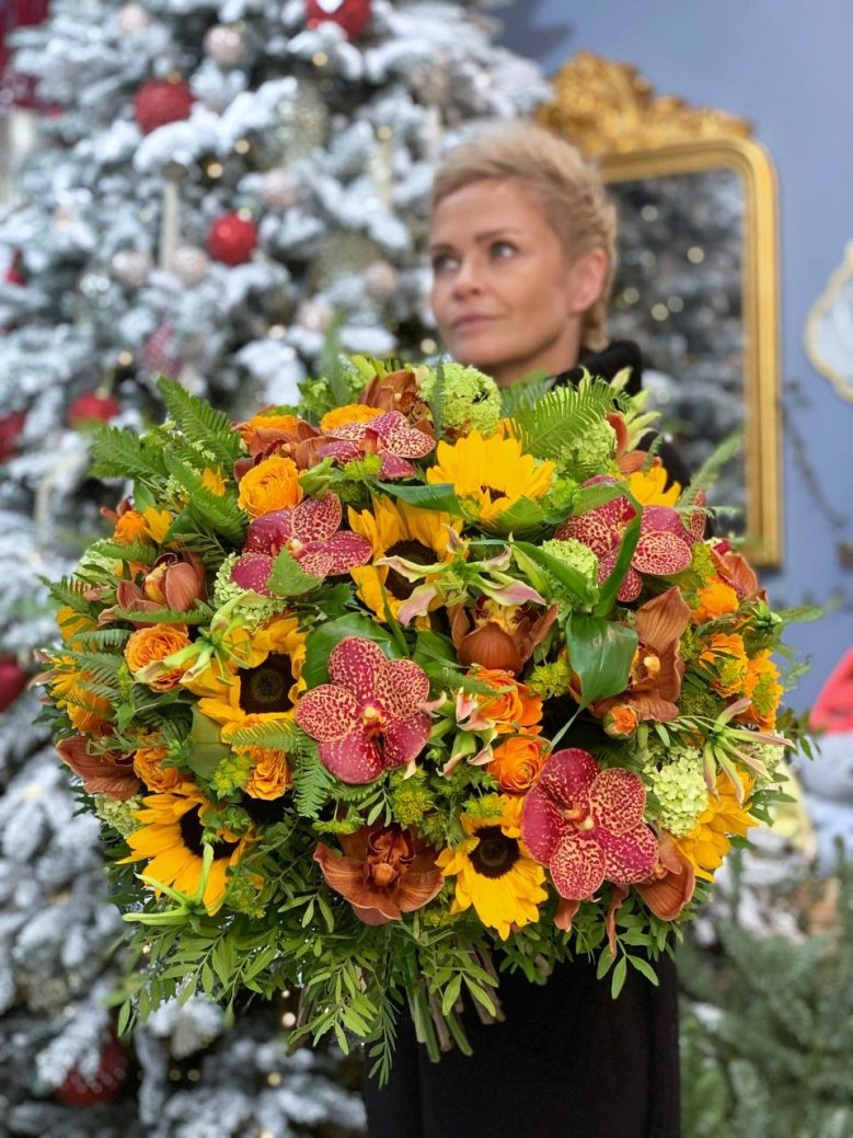 Авторский букет цветов — пионовидные розы, орхидеи, подсолнухи и глариоза