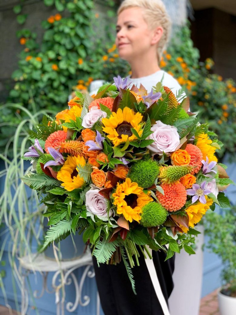 Авторский букет цветов — подсолнухи, садовые розы и георгины