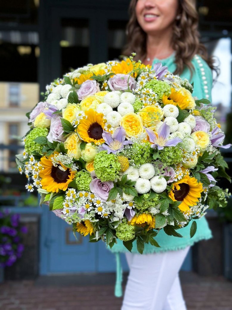 Авторский букет цветов — подсолнухи, садовые розы, матрикарии и клематисы