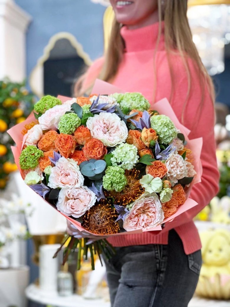 1. Каждый букет уникален и имеет сезонность, поэтому он может отличаться от того, который вы видите на картинке. Мы можем создать композицию в подобном стиле и цвете.