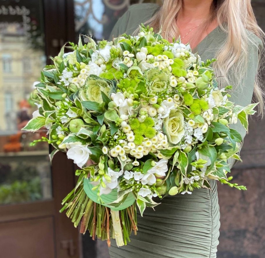 Свадебный букет цветов — ажурная брасика, ароматные флоксы, белые фрезии, сантини, танацетум и изящный хелеборус