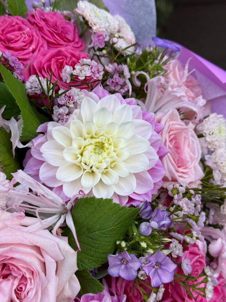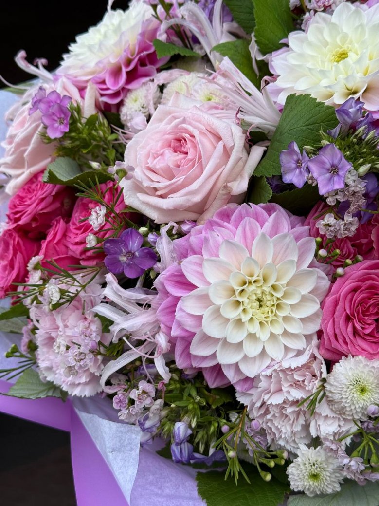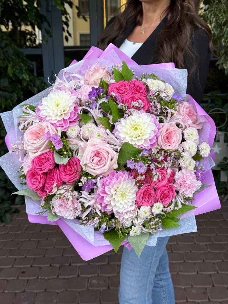 Букет цветов — георгины, ассорти роз и летний микс цветов