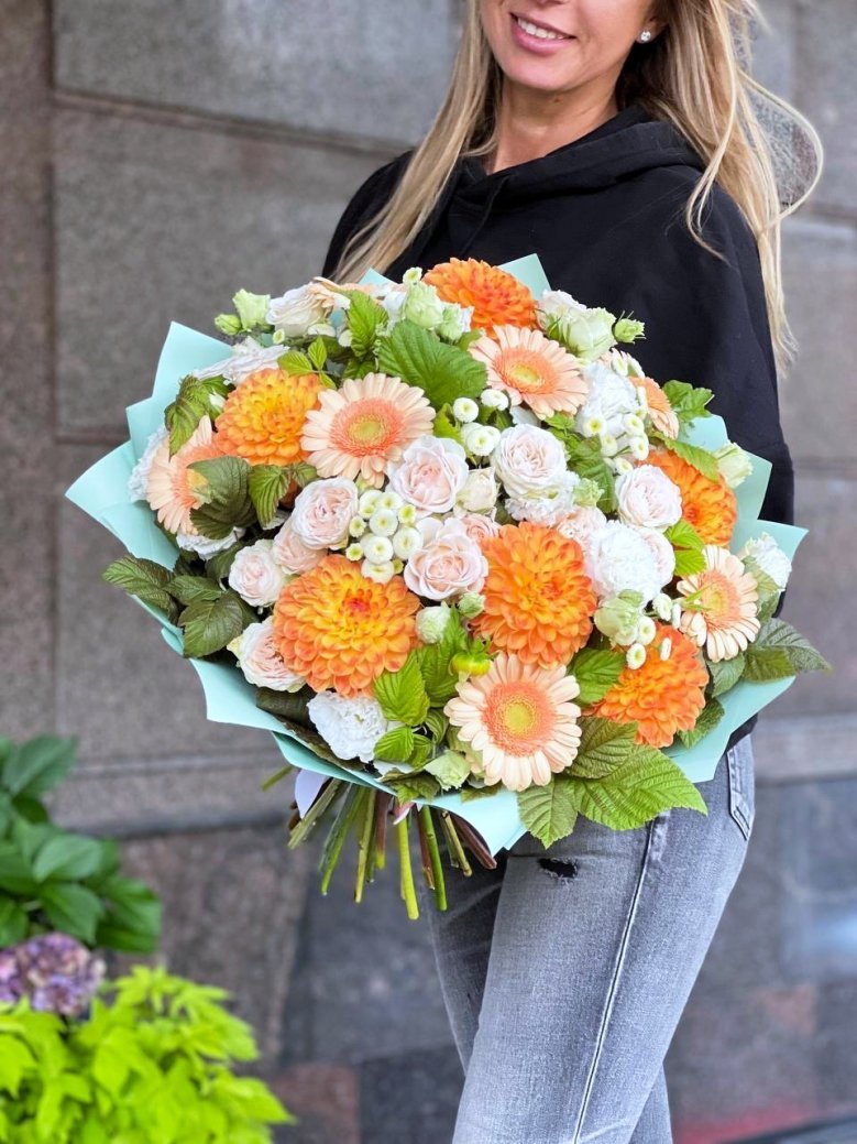 Букет цветов — георгины, пионовидные розы и минигерберы