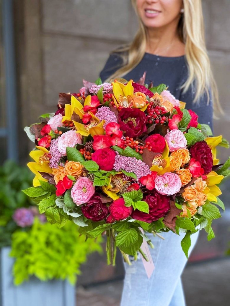 1. Каждый букет уникален и имеет сезонность, поэтому он может отличаться от того, который вы видите на картинке. Мы можем создать композицию в подобном стиле и цвете.