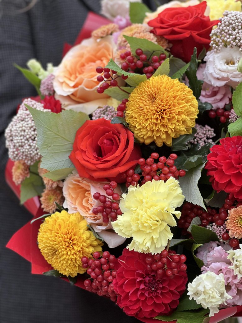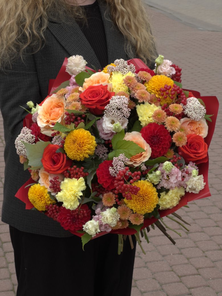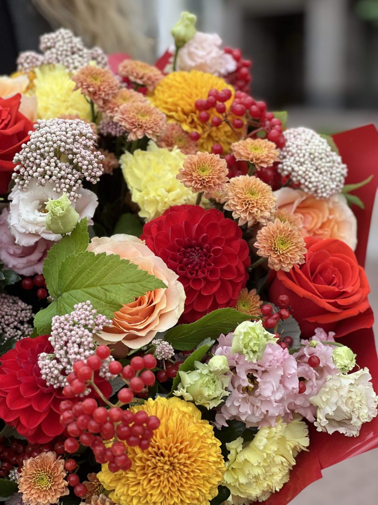 Букет цветов — георгины, садовая роза, хризантемы и ягоды