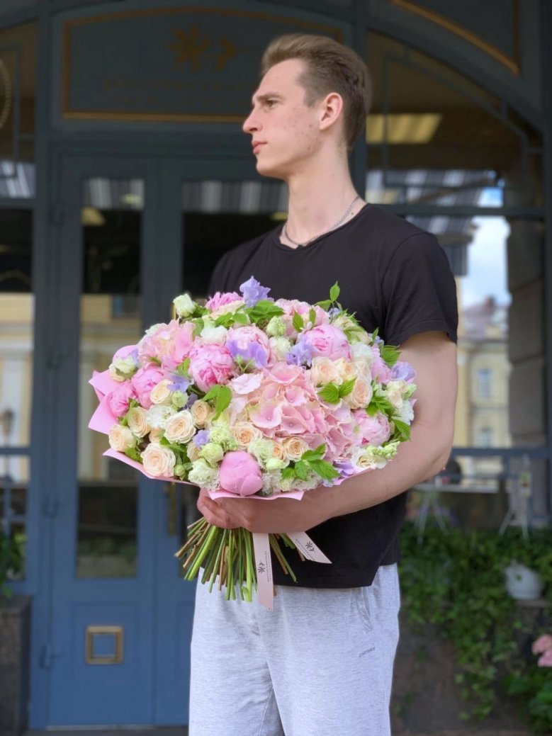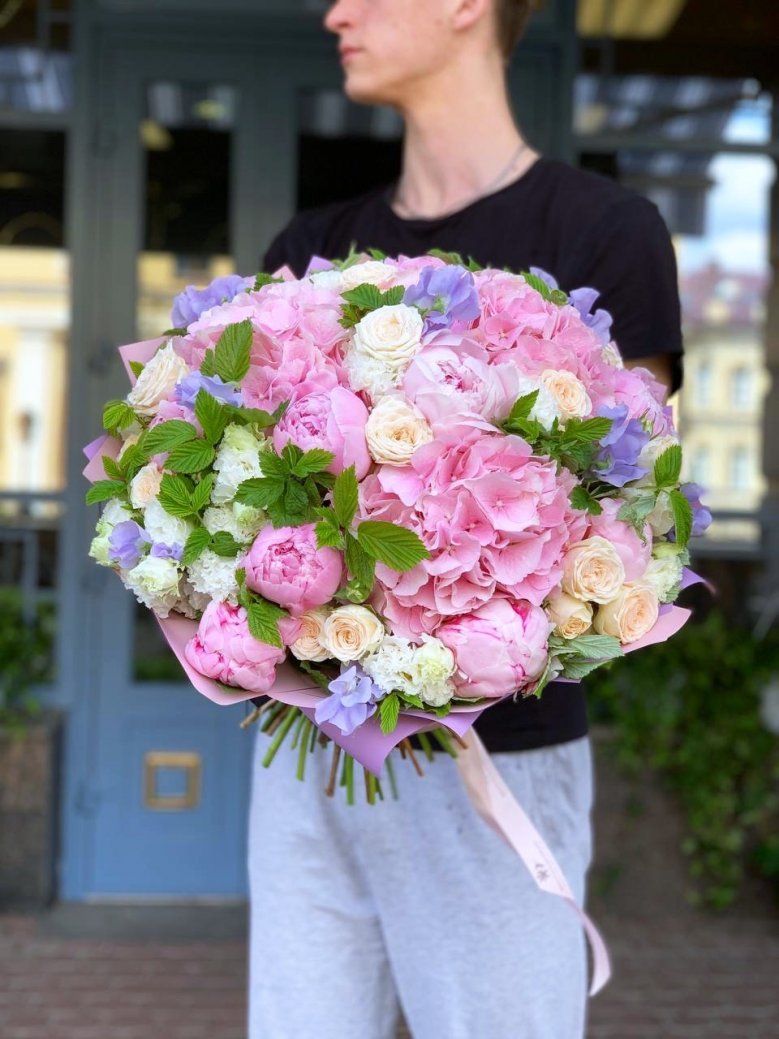 Все просмотренные товары Авторский букет цветов — гортензии, пионовидные розы, эустомы и малина