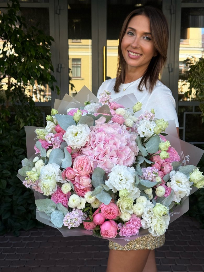 Букет цветов — гортензия, кустовые пионовидные розы, эустома и эвкалипт