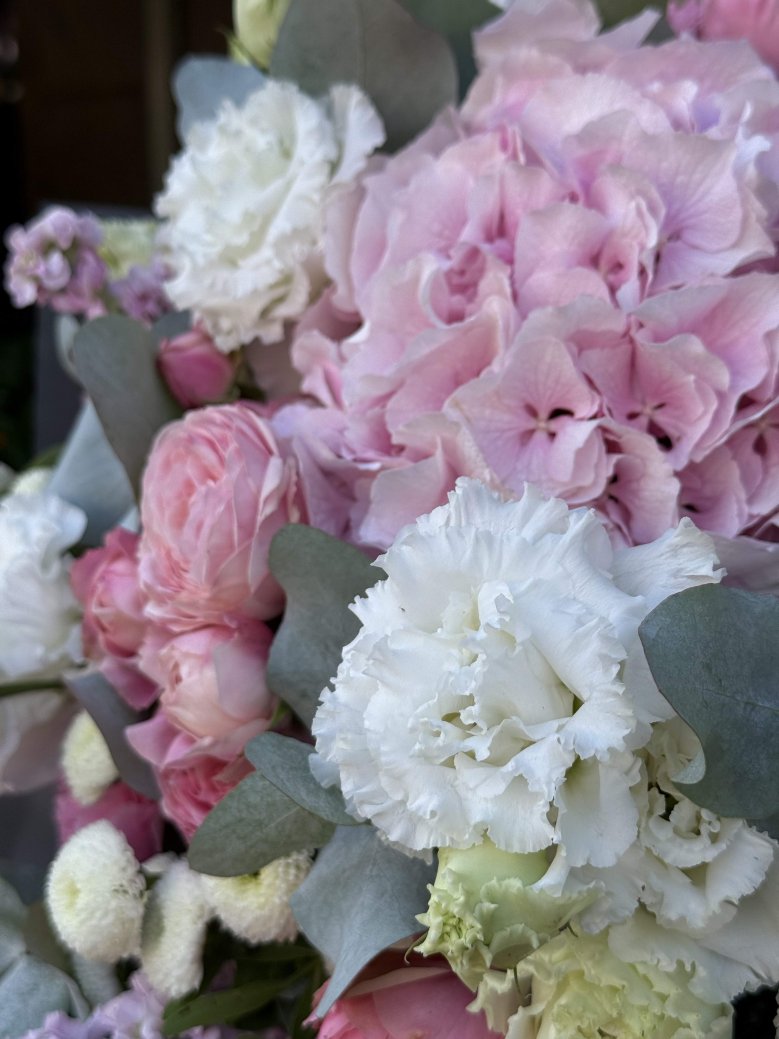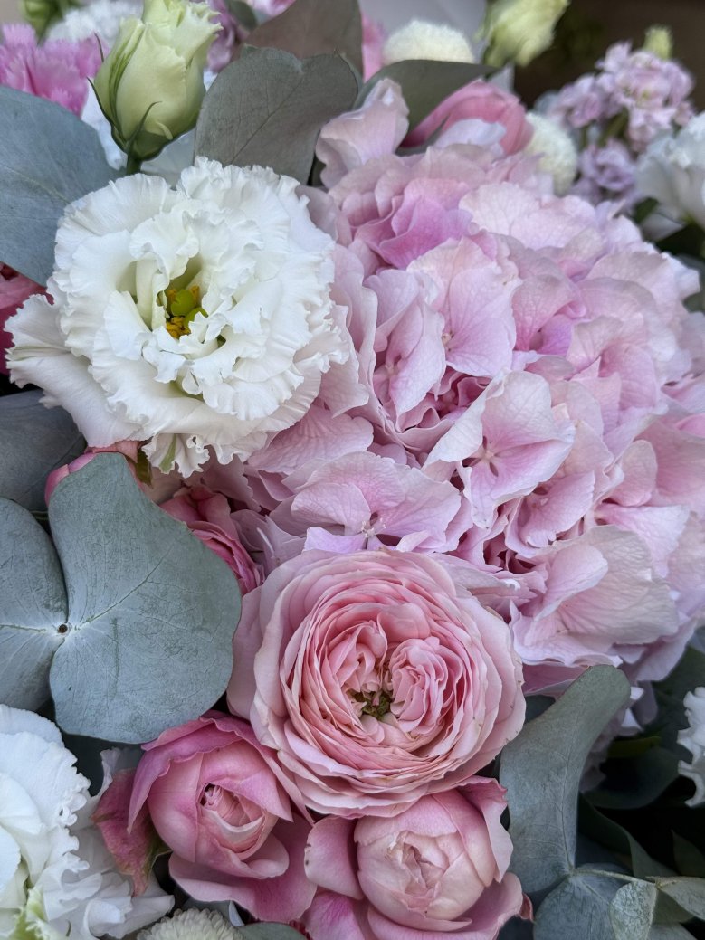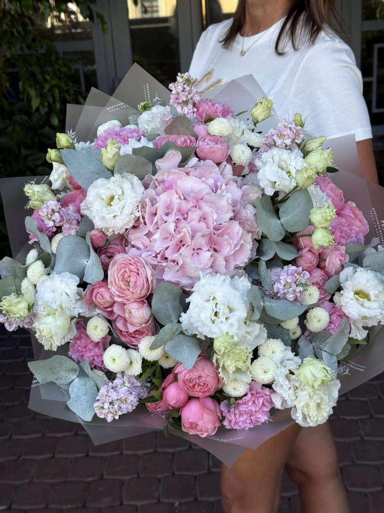В составе: гортензия, кустовая пионовидная роза, эустома, сантини, маттиола, диантус и эвкалипт