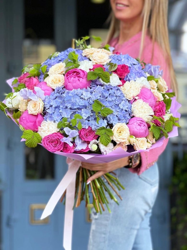 Букет цветов — гортензия, пионы, розы и латирус Вы можете заказать на сайте салона Цветочное изобилие. Цена 19 000 руб. В составе букета только свежие цветы, которые не завянут через несколько дней. Все цветочные композиции, представленные на сайте, являются авторскими. Каждый букет мы собираем учитывая все Ваши пожелания.