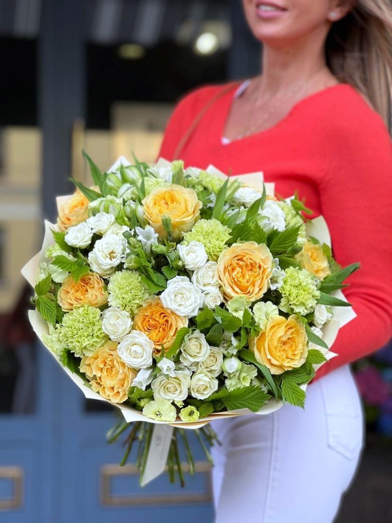 1. Каждый букет уникален и имеет сезонность, поэтому он может отличаться от того, который вы видите на картинке. Мы можем создать композицию в подобном стиле и цвете.