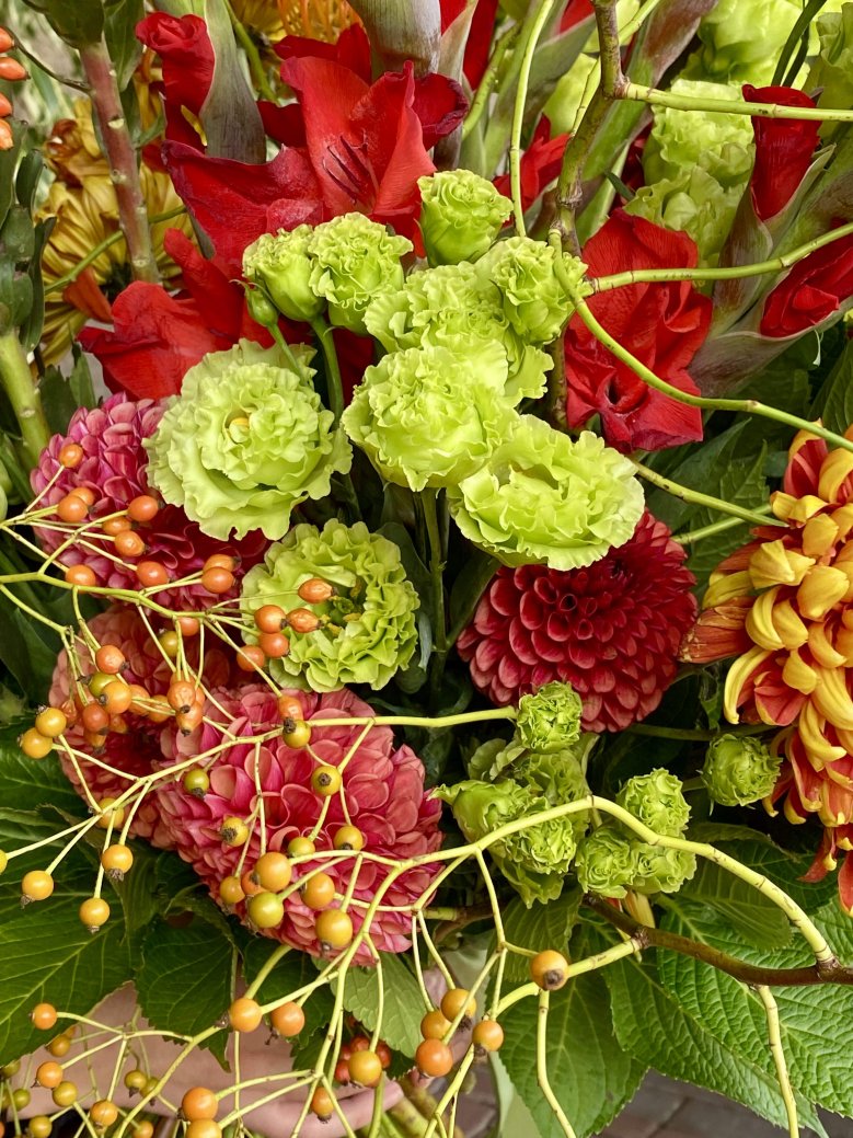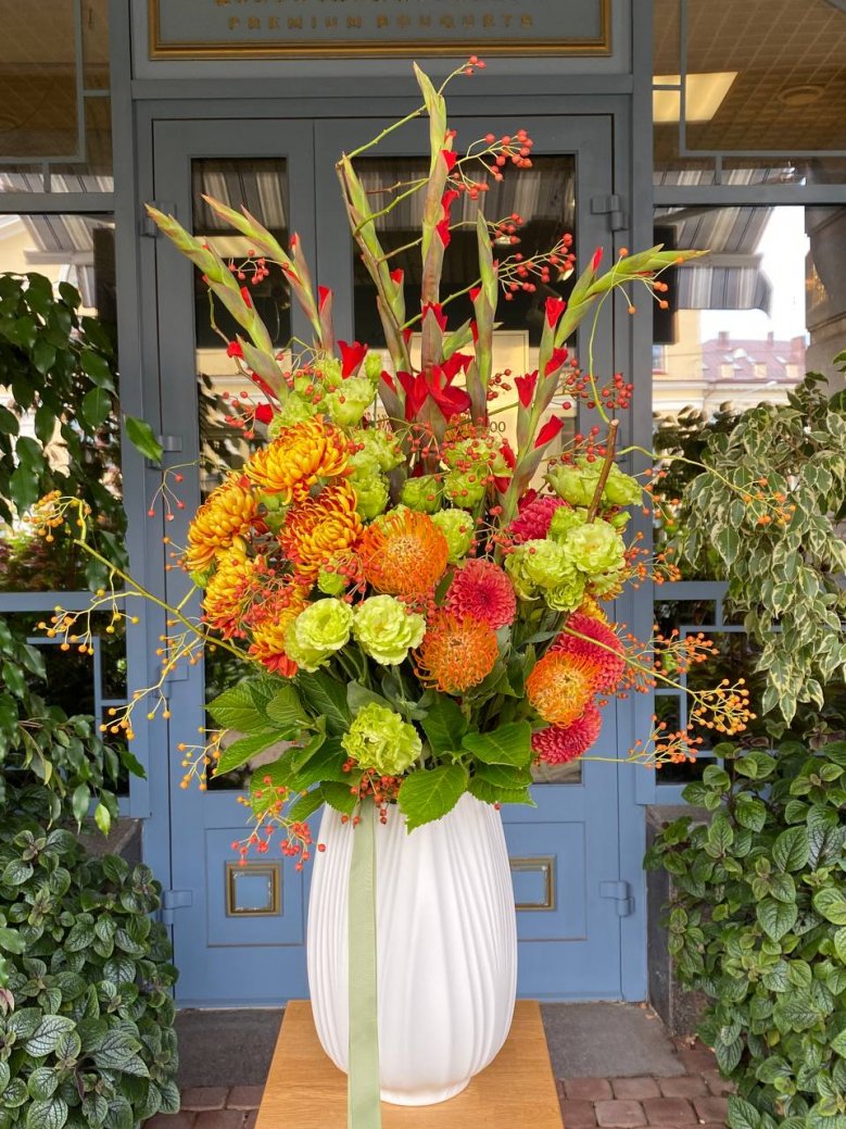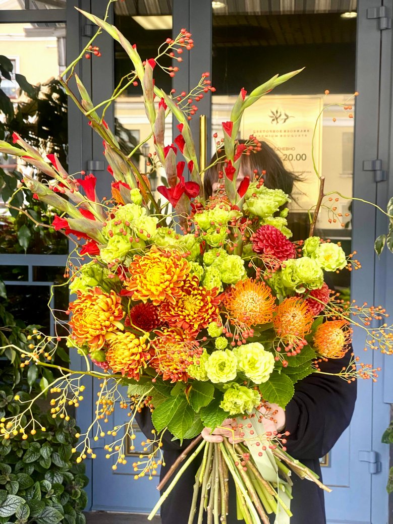 Состав: георгин, нутан, хризантема одноголовая, эустома, гладиолус, ветви шиповника и зелень