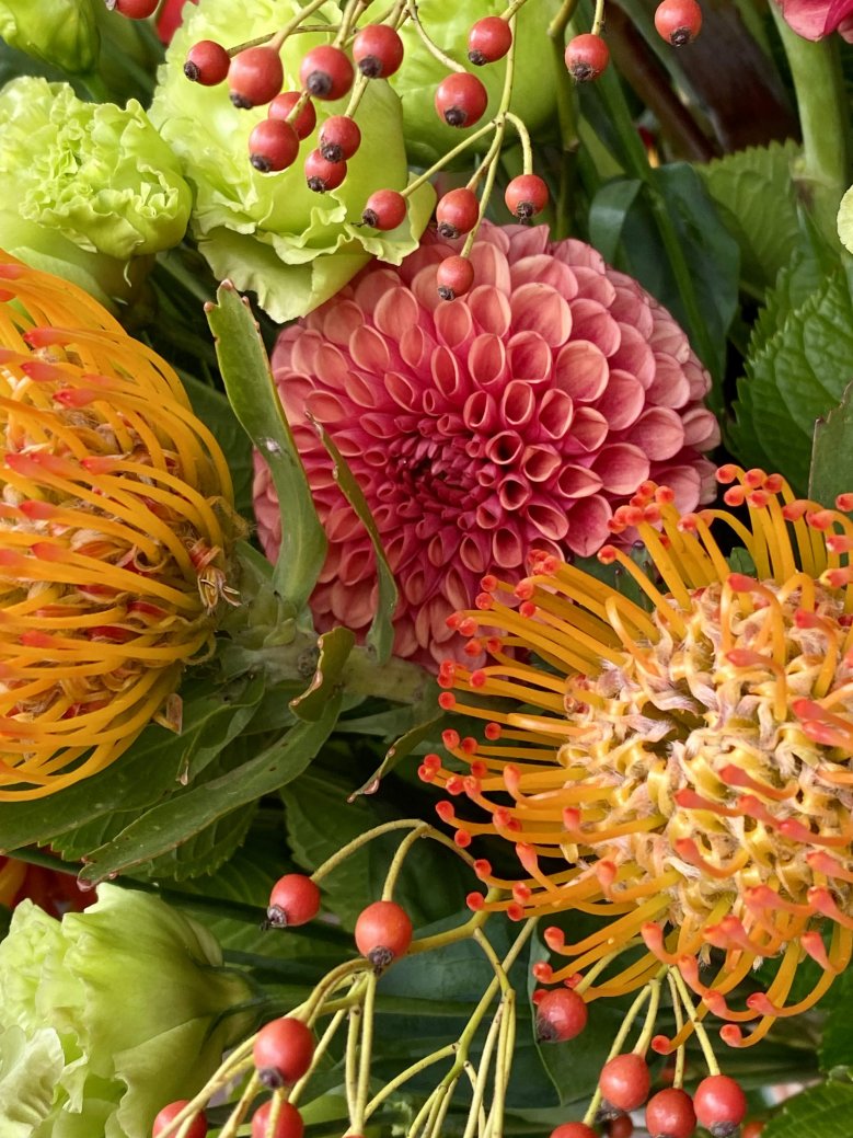 Букет цветов — нутан, хризантема, лизиантус, георгин и шиповник
