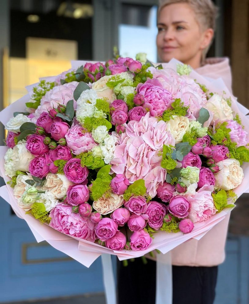 Букет цветов — пионы, гортензия, пионовидные и садовые розы