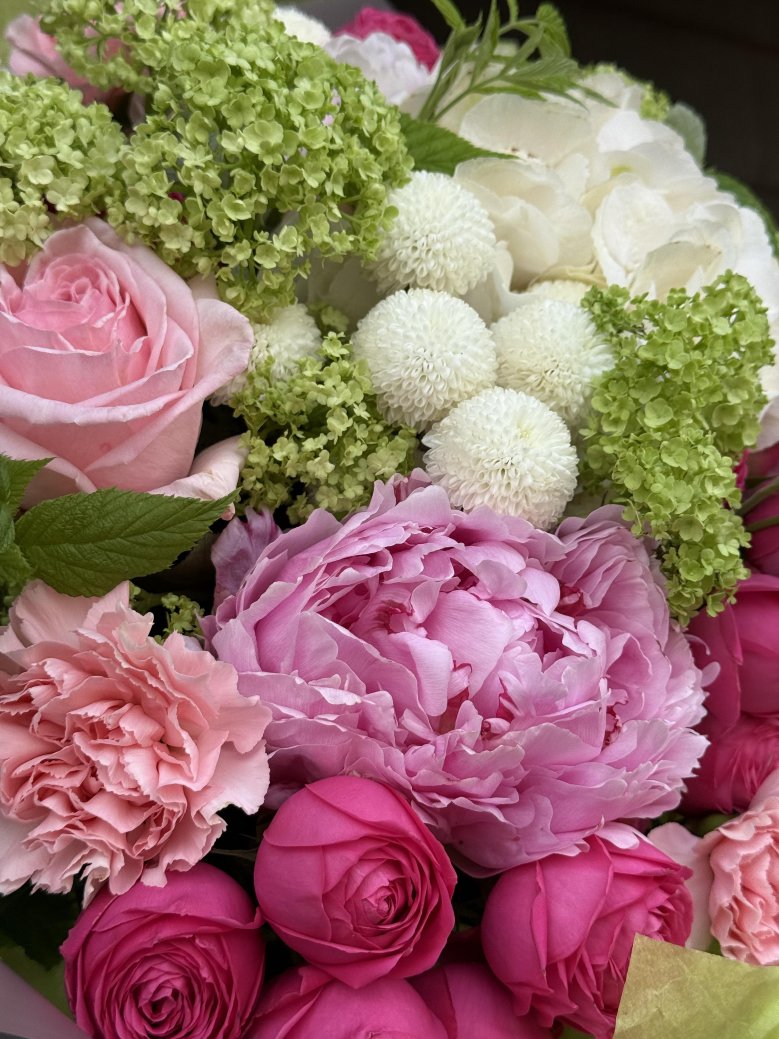 Состав: пионы, гортензия, вибурнум, кустовая и одноголовая садовые розы, хризантема, диантус и малина