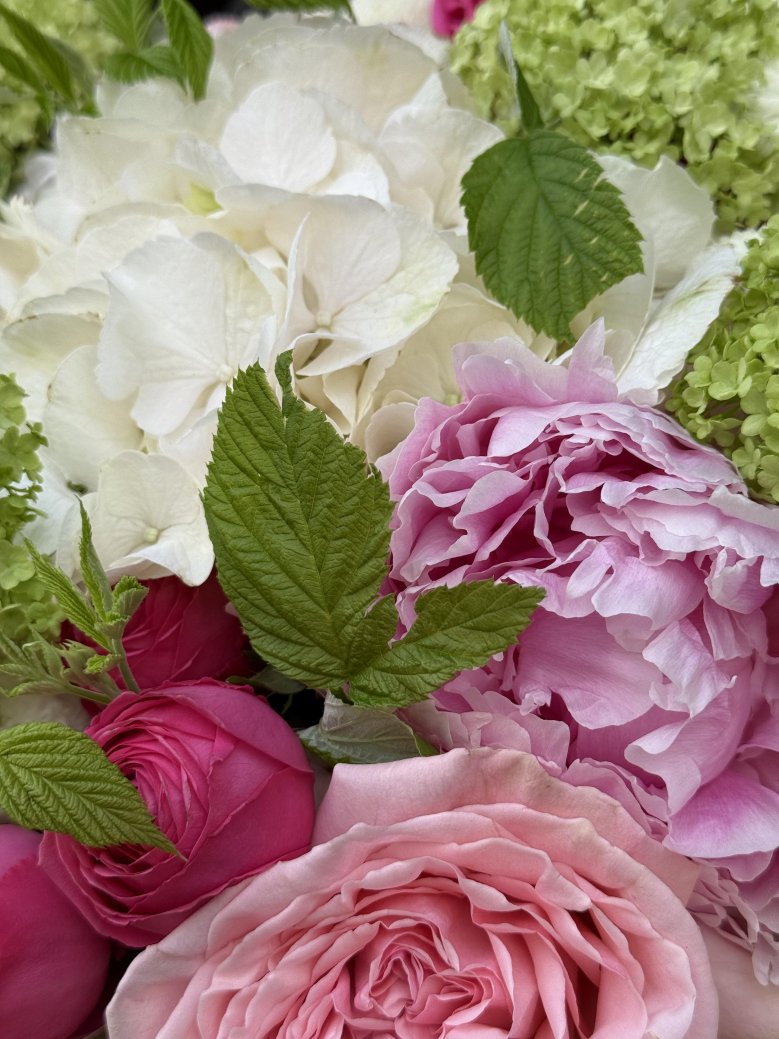 Букет цветов — гортензия, садовая пионовидная роза, маттиола, альстромерия и малина