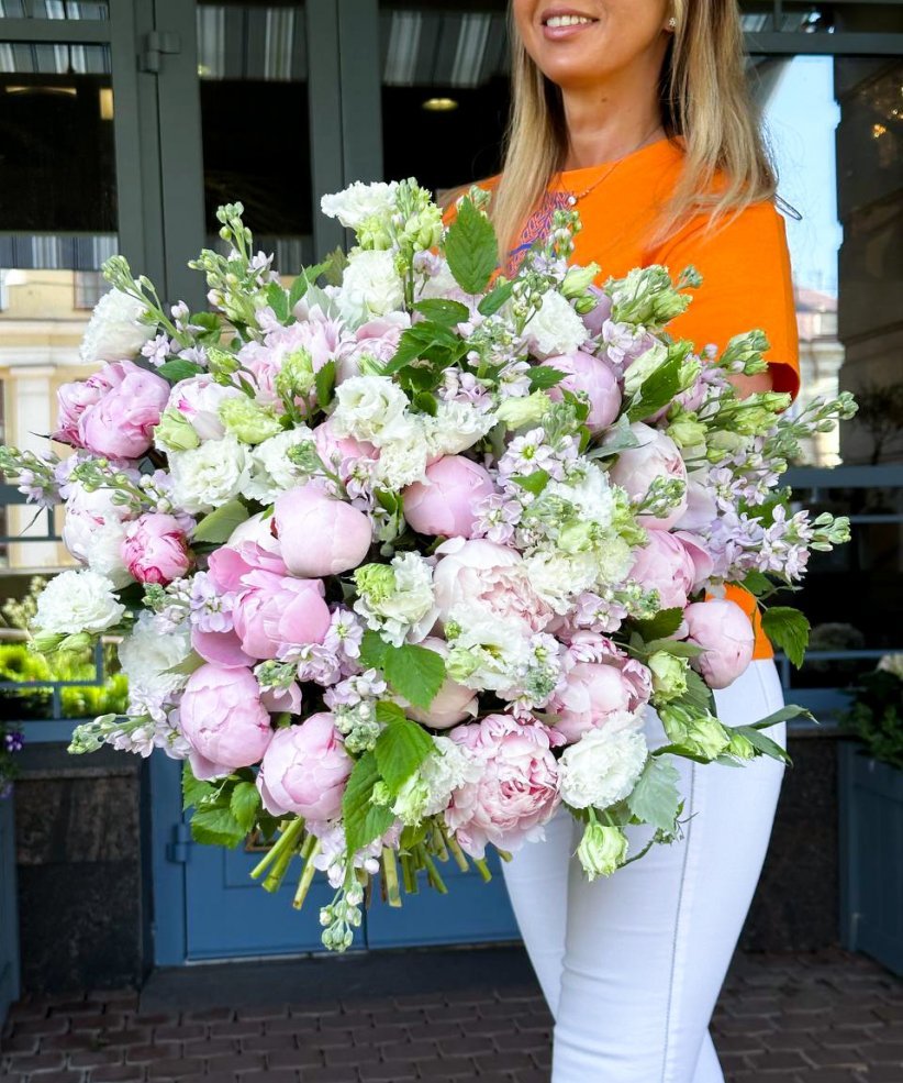 Букет цветов — пионы, маттиола и эустома Вы можете заказать на сайте салона Цветочное изобилие. Цена 32 000 руб. В составе букета только свежие цветы, которые не завянут через несколько дней. Все цветочные композиции, представленные на сайте, являются авторскими. Каждый букет мы собираем учитывая все Ваши пожелания.