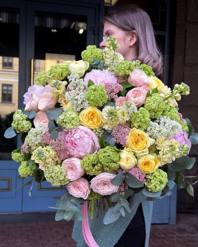 Букет цветов — пионы, пионовидные и садовые розы, маттиола, сирень