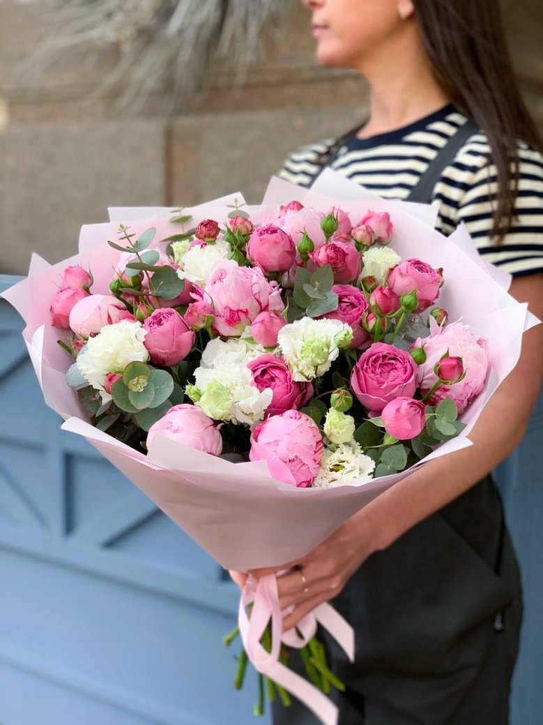 Букет цветов — пионы, пионовидные розы и лизиантусы