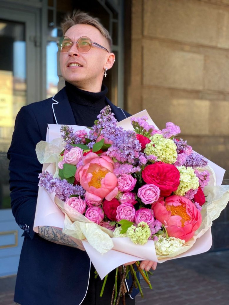 Букет цветов — пионы, пионовидные розы, вибурнум