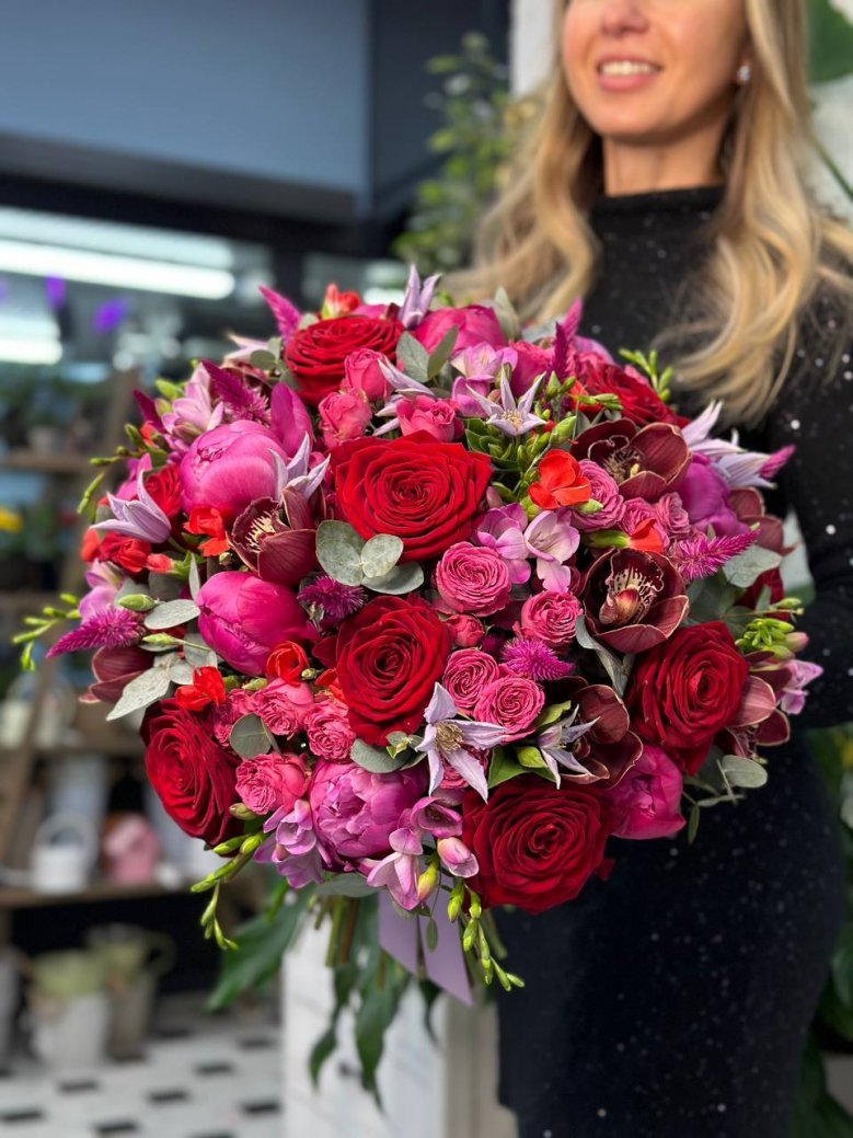 Состав: пион, садовая роза, ароматная фрезия и клематис