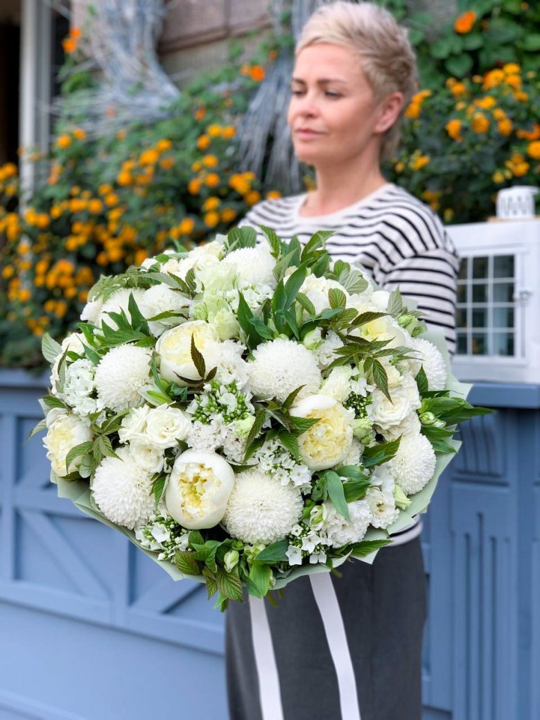 Букет цветов — пионы, садовые розы и хризантемы