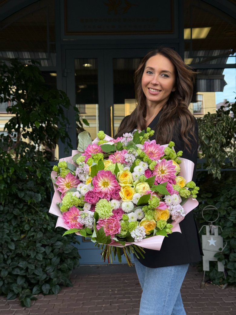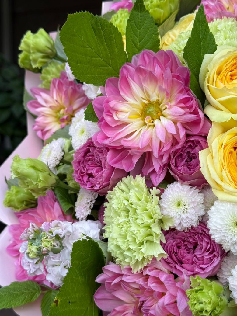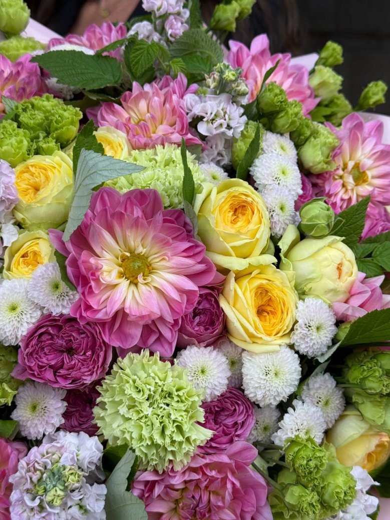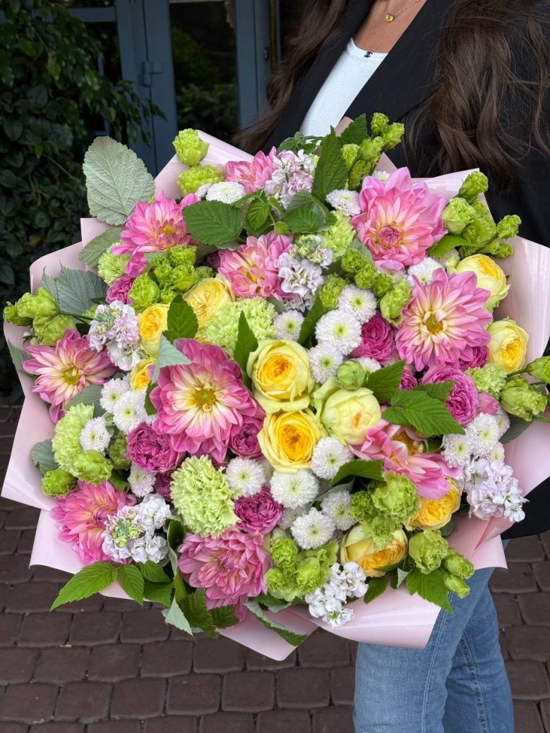 Состав: пионовидная роза, георгины, диантус, лизиантус, микс цветов и зелень