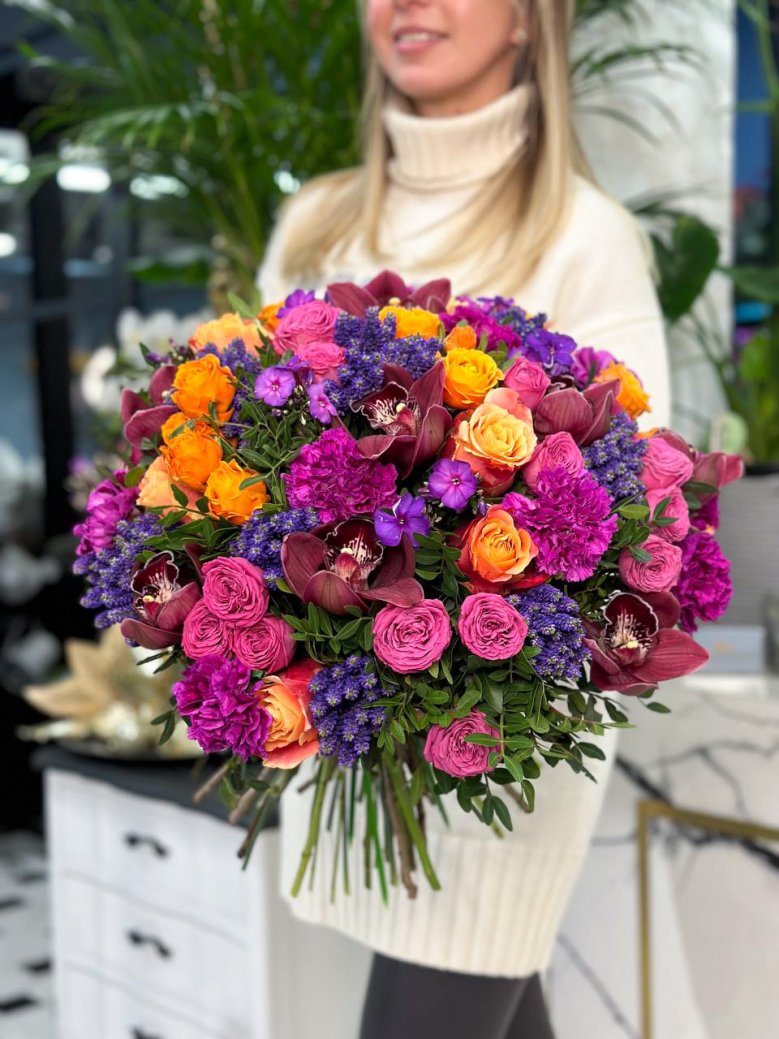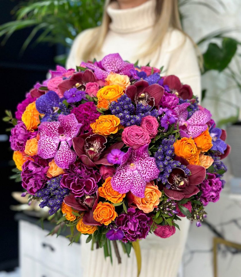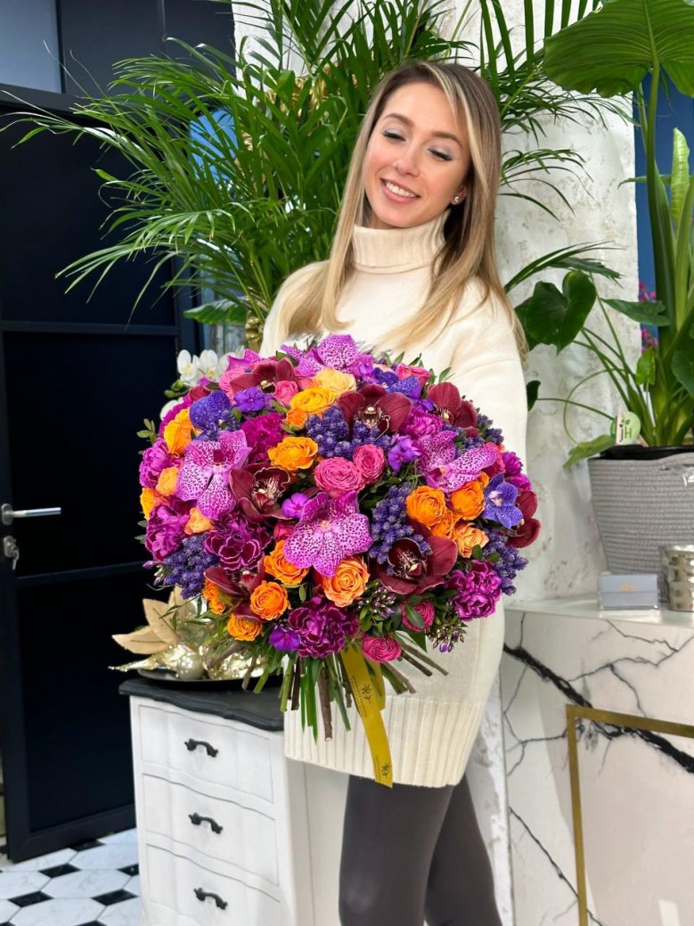 Букет цветов — пионовидные розы, орхидеи, ранункулюсы и целозия