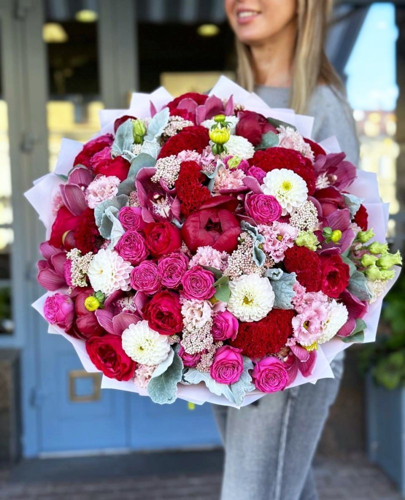 Букет цветов — пионовидные розы, лизиантусы, георгины и орхидеи