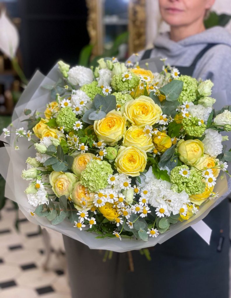 Букет цветов — пионовидные розы, матрикарии, эустомы и тюльпаны