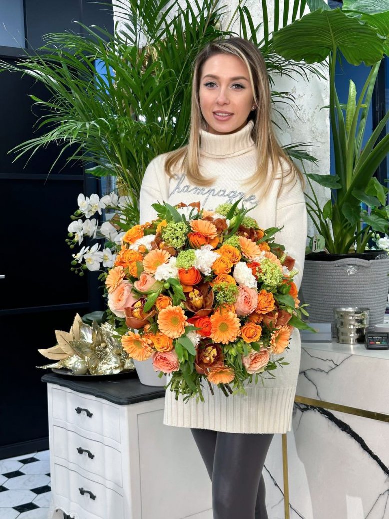 Авторский букет цветов — георгины, пионовидные розы, вибурнум и орхидеи