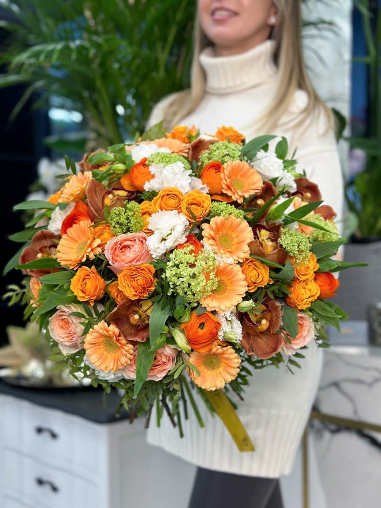 Букет цветов — пионовидные розы, ранункулюсы, герберы, вибурнум и орхидеи