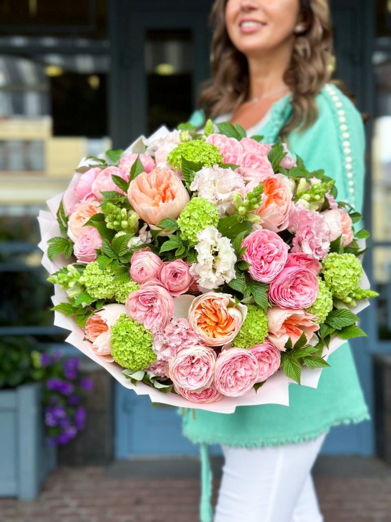 Букет цветов — пионовидные розы, вибурнумы и антирринум