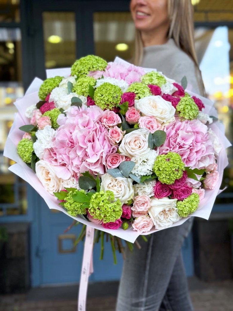 Букет цветов — пионовидные розы, вибурнумы и гортензии