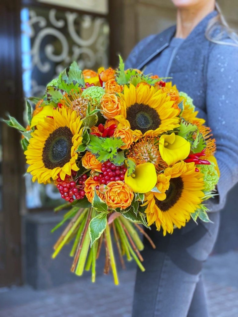 Букет цветов — подсолнухи, каллы, калина и пионовидные розы
