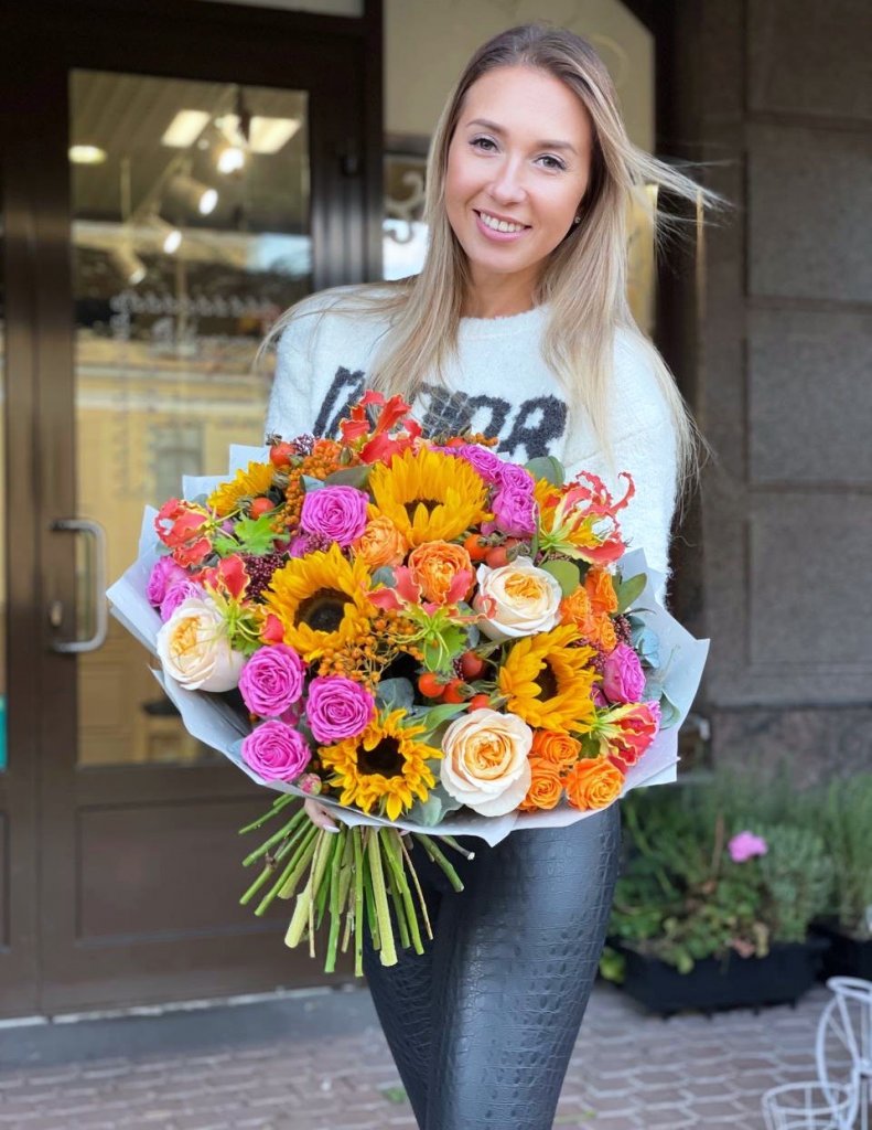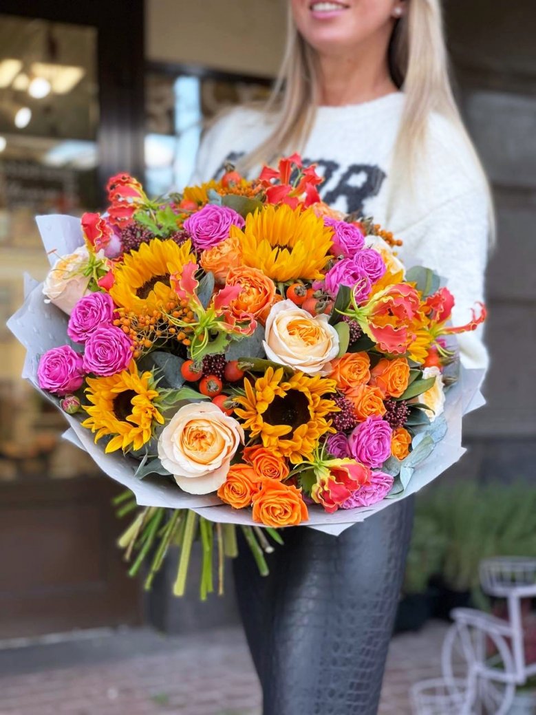 Букет цветов — подсолнухи, каллы, пионовидная роза, плоды шиповника и глариоза
