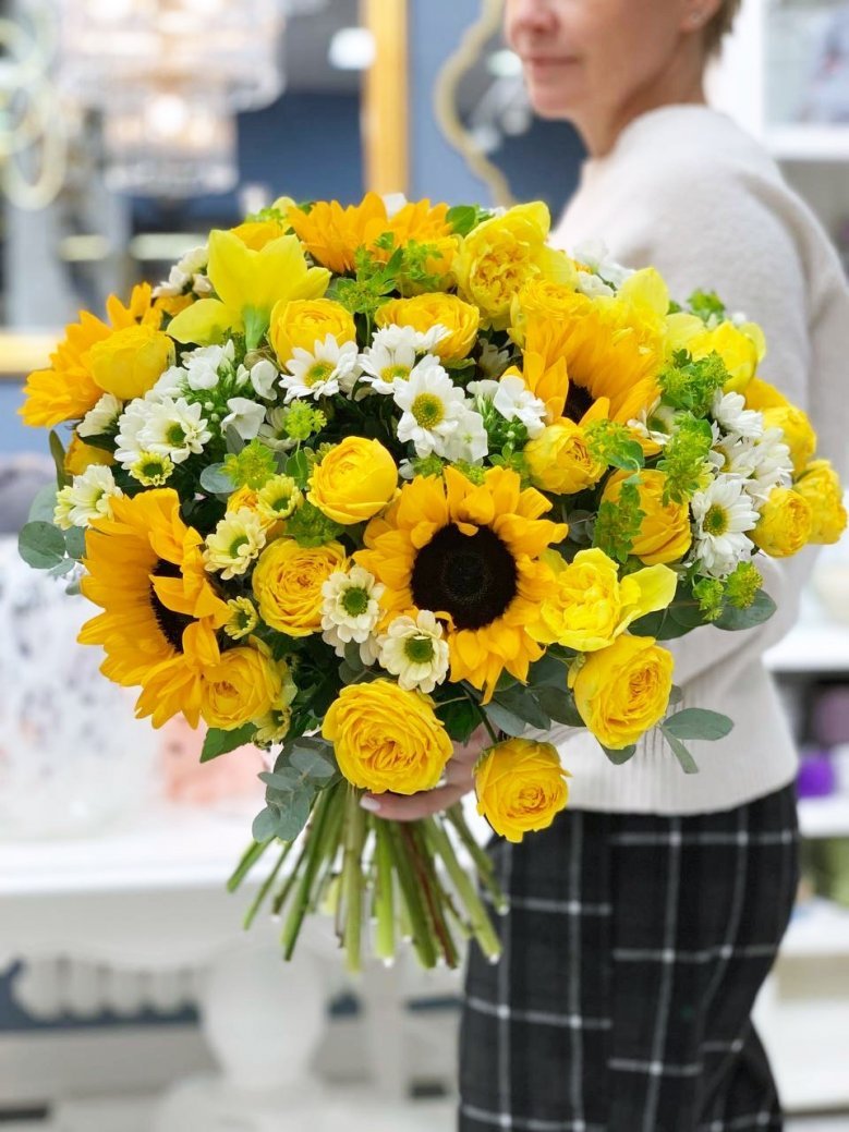 Подсолнухи, сантини, пионовидные розы и нарциссы