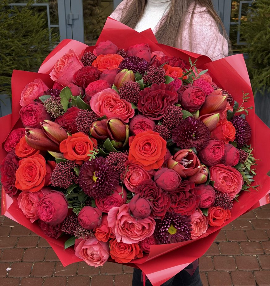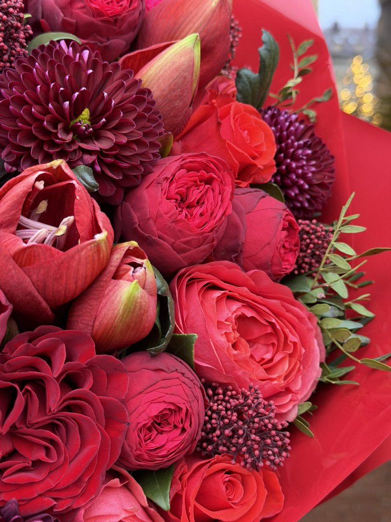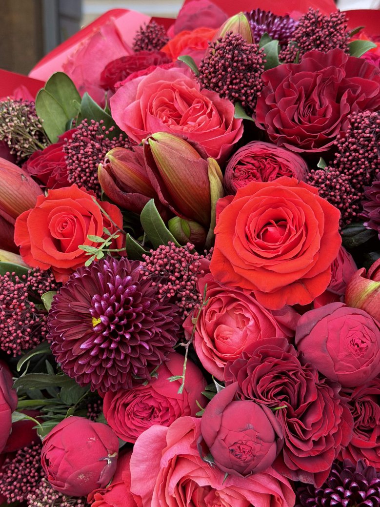 Состав: амариллис, ассорти одноголовой и кустовой садовой розы, скиммия, одноголовая хризантема, сезонная зелень