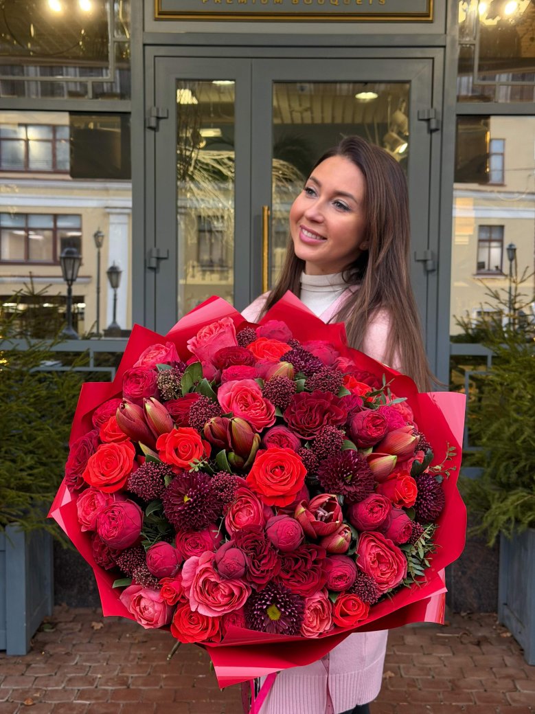 1. Каждый букет уникален и имеет сезонность, поэтому он может отличаться от того, который вы видите на картинке. Мы можем создать композицию в подобном стиле и цвете.