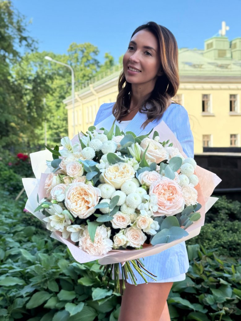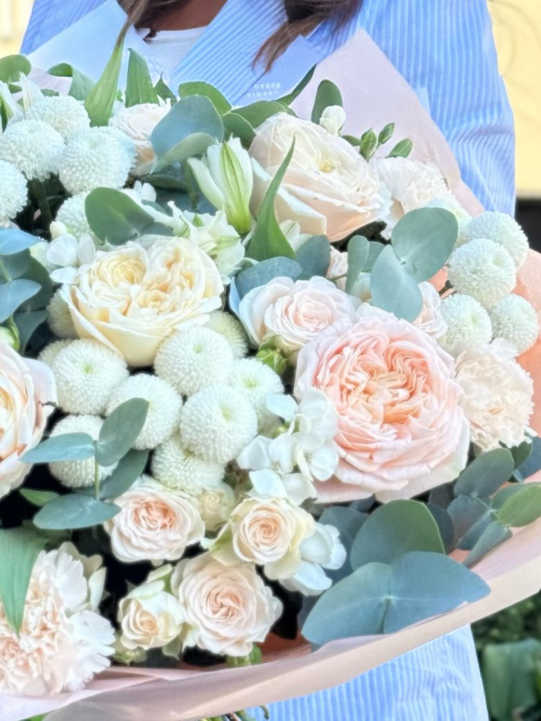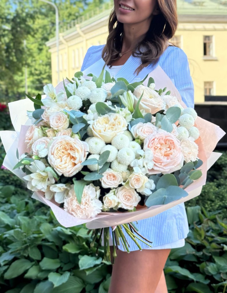 Букет цветов — садовая пионовидная роза, кустовая роза, альстромерия и эвкалипт