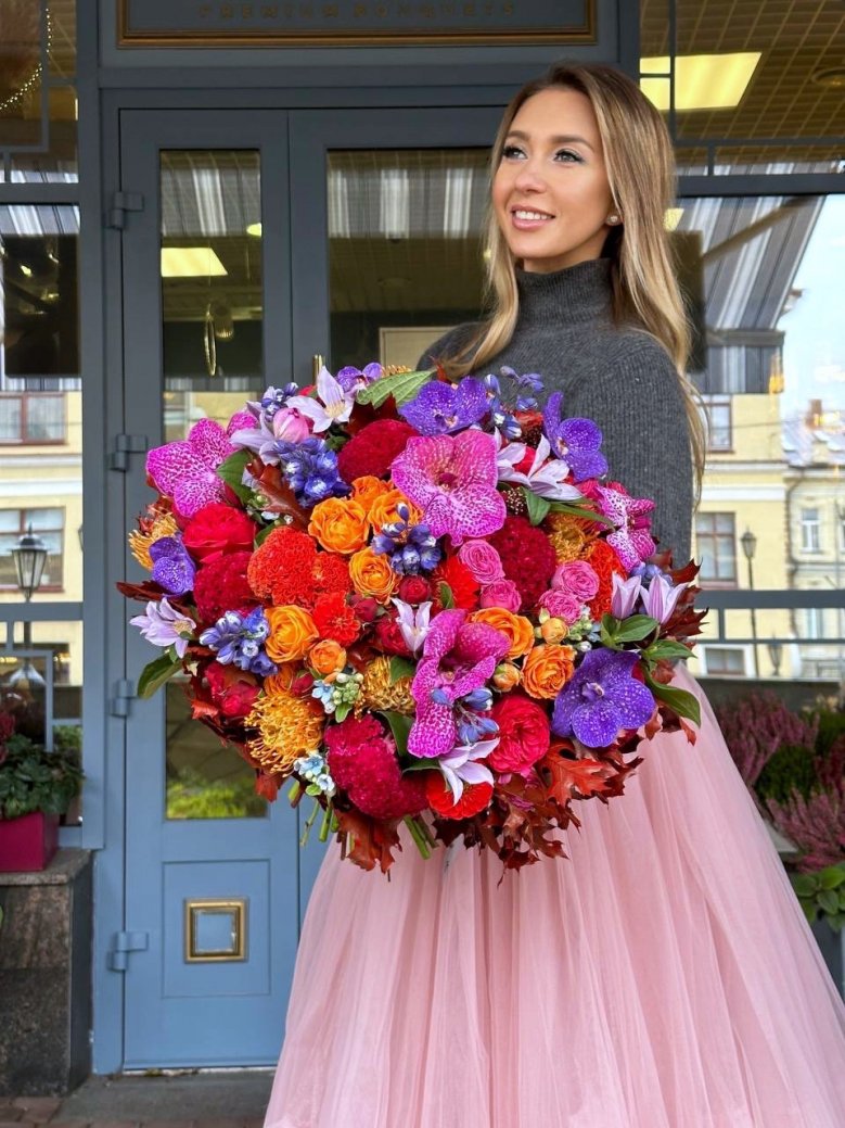 Авторский букет цветов — пионовидные розы, хризантемы и орхидеи