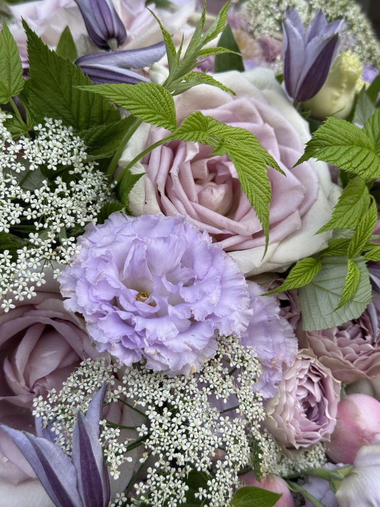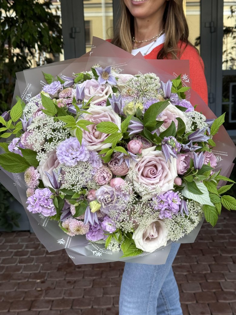 Состав: садовая одноголовая роза, кустовая пионовидная роза, клематис, маттиола, хризантема, лизиантус и малина