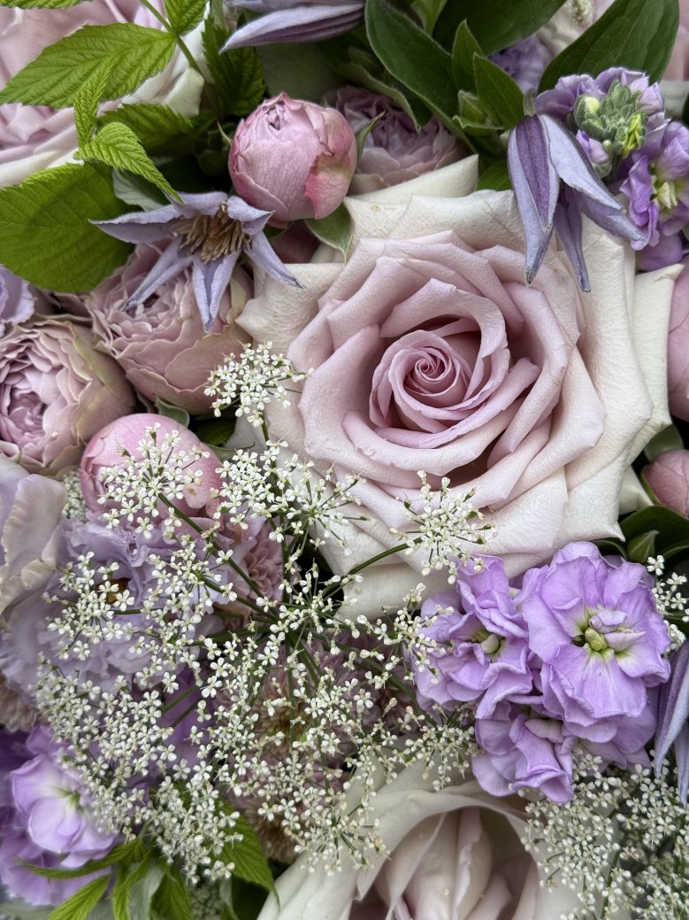 Букет цветов — садовая роза, клематисы, пионовидная роза и маттиола
