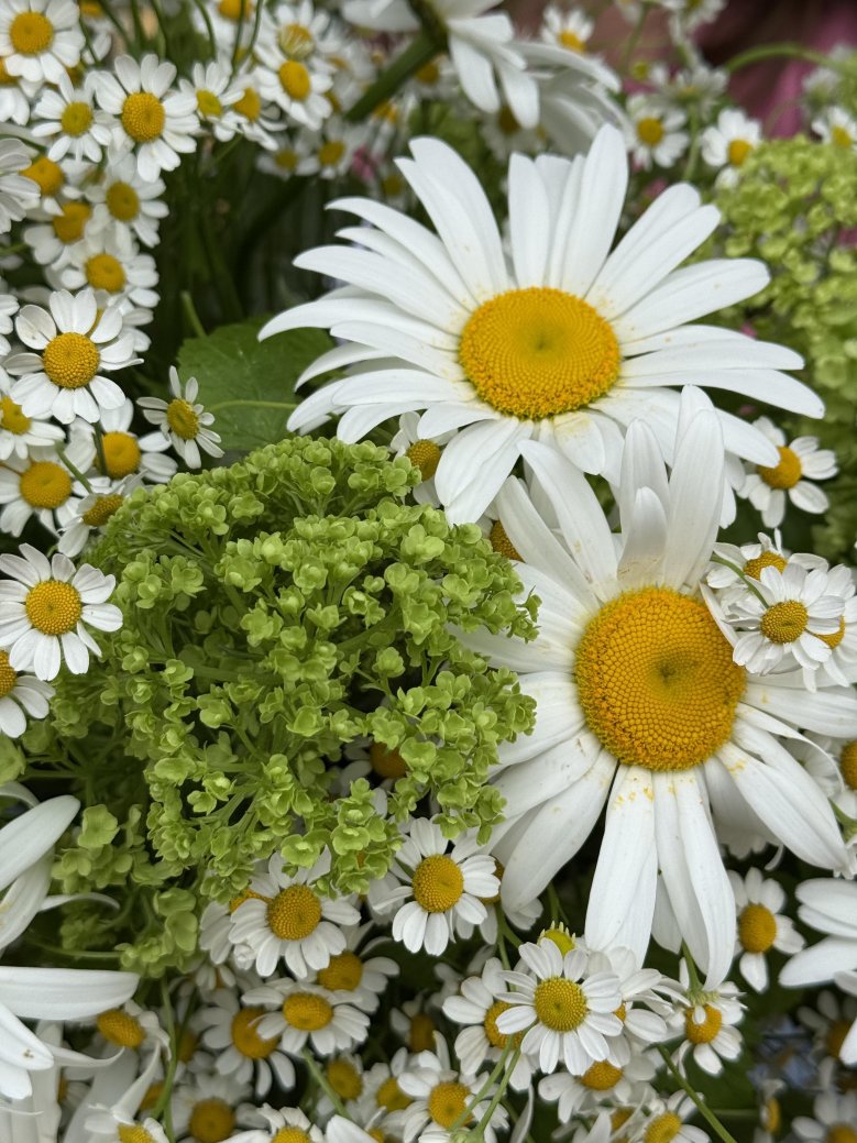 Букет цветов — садовые ромашки, матрикария, вибурнум и малина