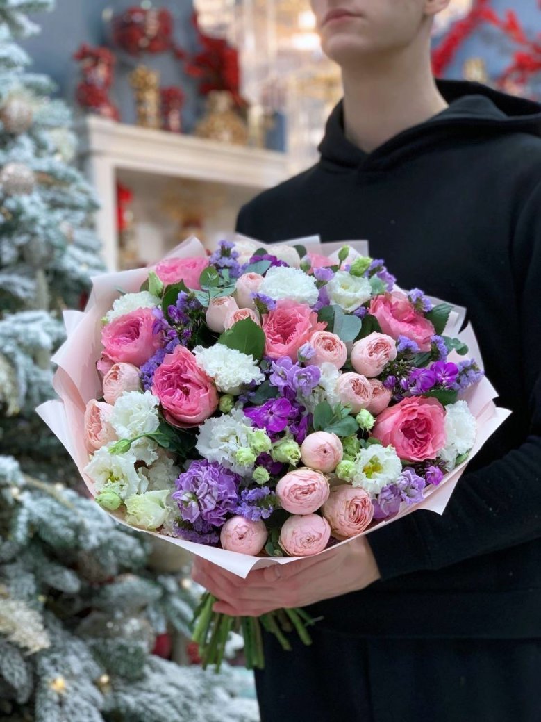 Авторский букет цветов — ранункулюсы, лавандовые розы, маттиола и душистый горошек