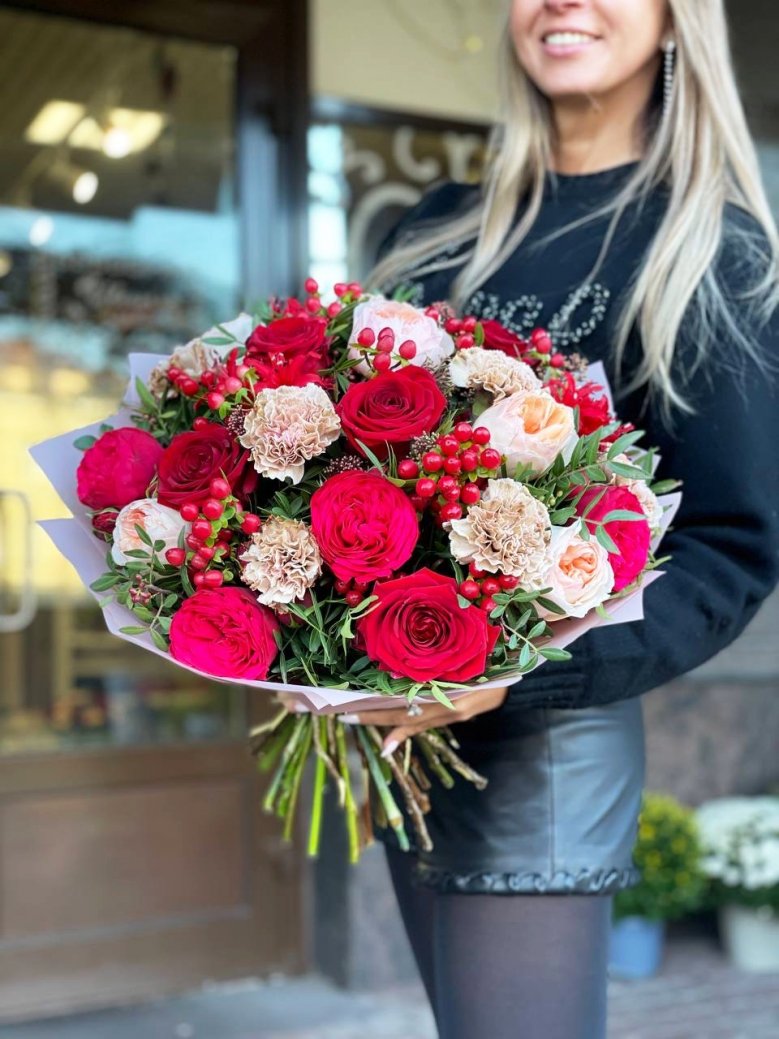 Букет цветов — три вида шикарных роз, винтажная гвоздика и ягодки хиперикума