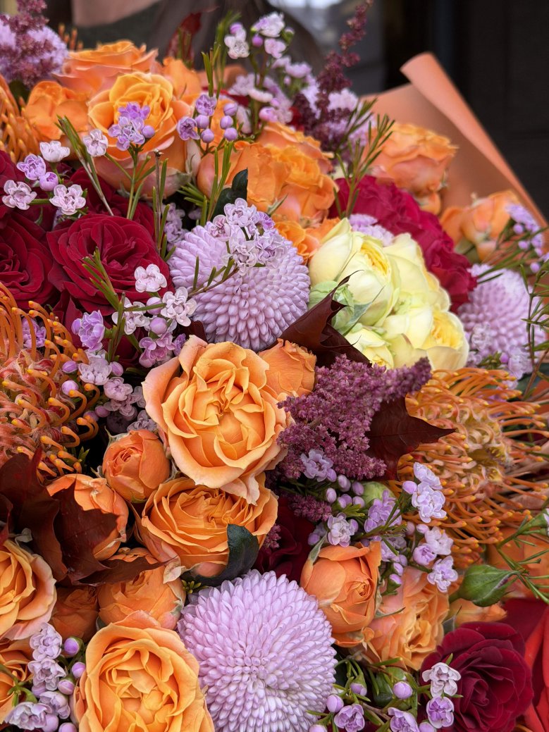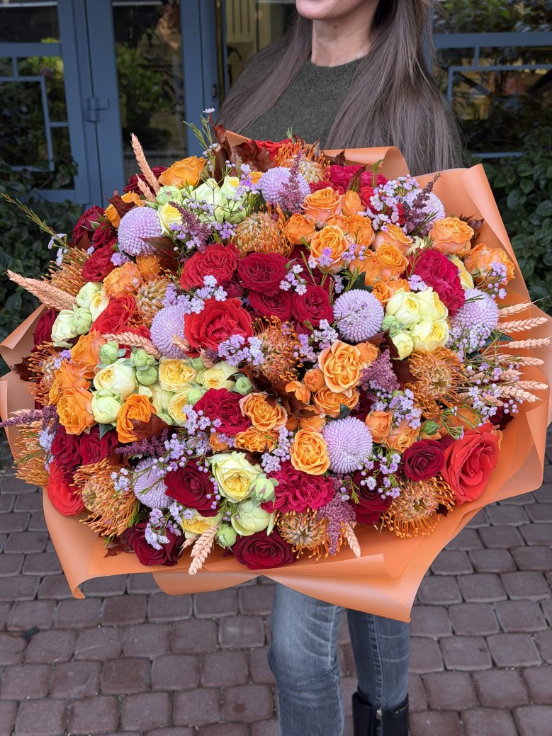 1. Каждый букет уникален и имеет сезонность, поэтому он может отличаться от того, который вы видите на картинке. Мы можем создать композицию в подобном стиле и цвете.